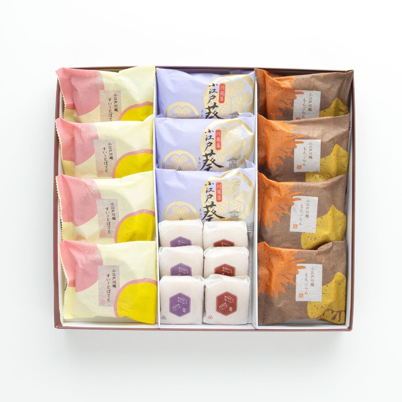 内容:亀の最中つぶあん・こしあん各3個、小江戸葵3個、小江戸川越すいーとぽてと4個、小江戸川越もんぶらん4個